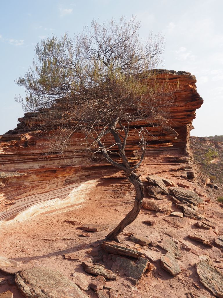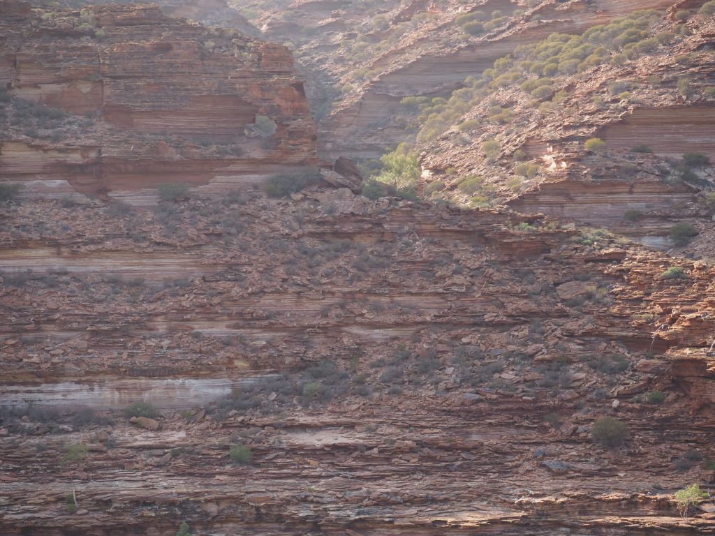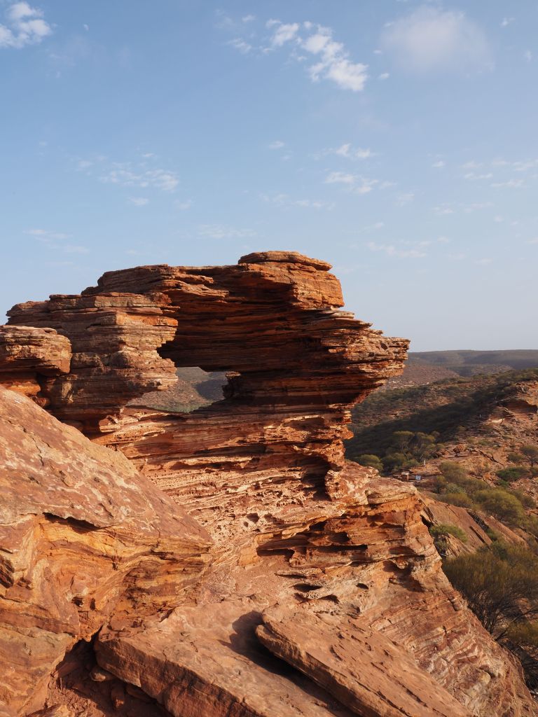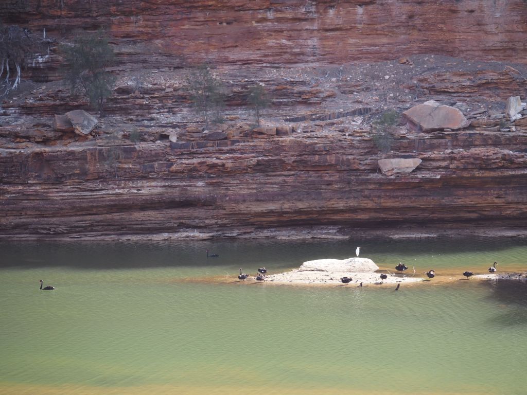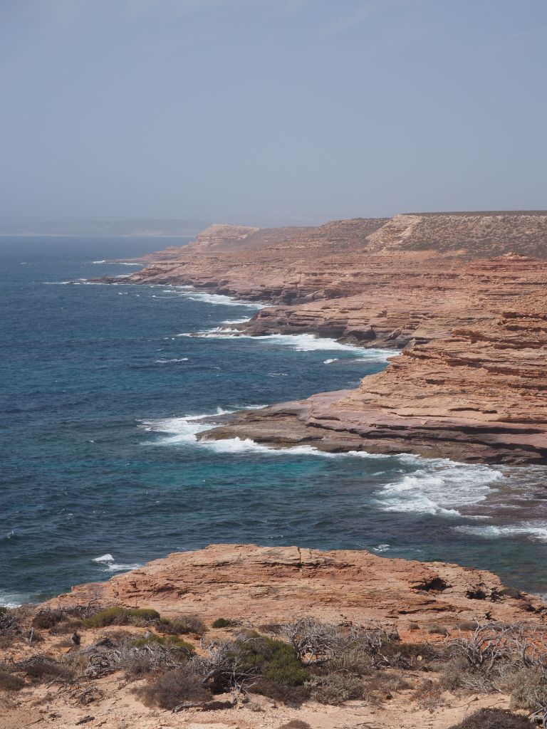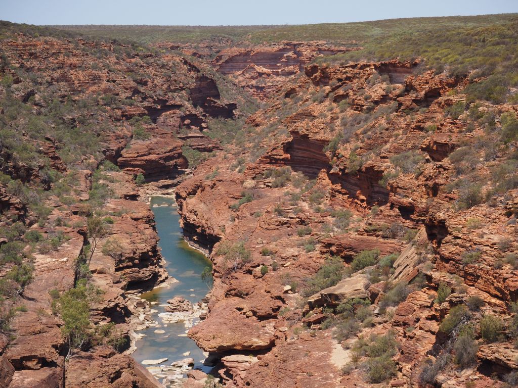 Kalbarri turned out to be a fun, quick stop for a last taste of the incredible rock formations in this part of the world. The park is actually split into two parts–there’s an inland part where a high escarpment has huge gorges carved into it by a river, and then a section where dramatic cliffs zigzag along the coast. I met up with a friend there and we first went to take a look at the cliffs, which were really beautiful in the afternoon light, and then to go for a nice refreshing dip. The next day we headed inland. It was pretty hot for the hike, but not bad compared to the temperatures I’d been getting up north. It kind of felt to be a bit like a mini Karijini, and going in without any real expectations was perfect. We did a couple of short-ish hikes, had a nice refreshing dip, and checked out a couple of cool viewpoints.
