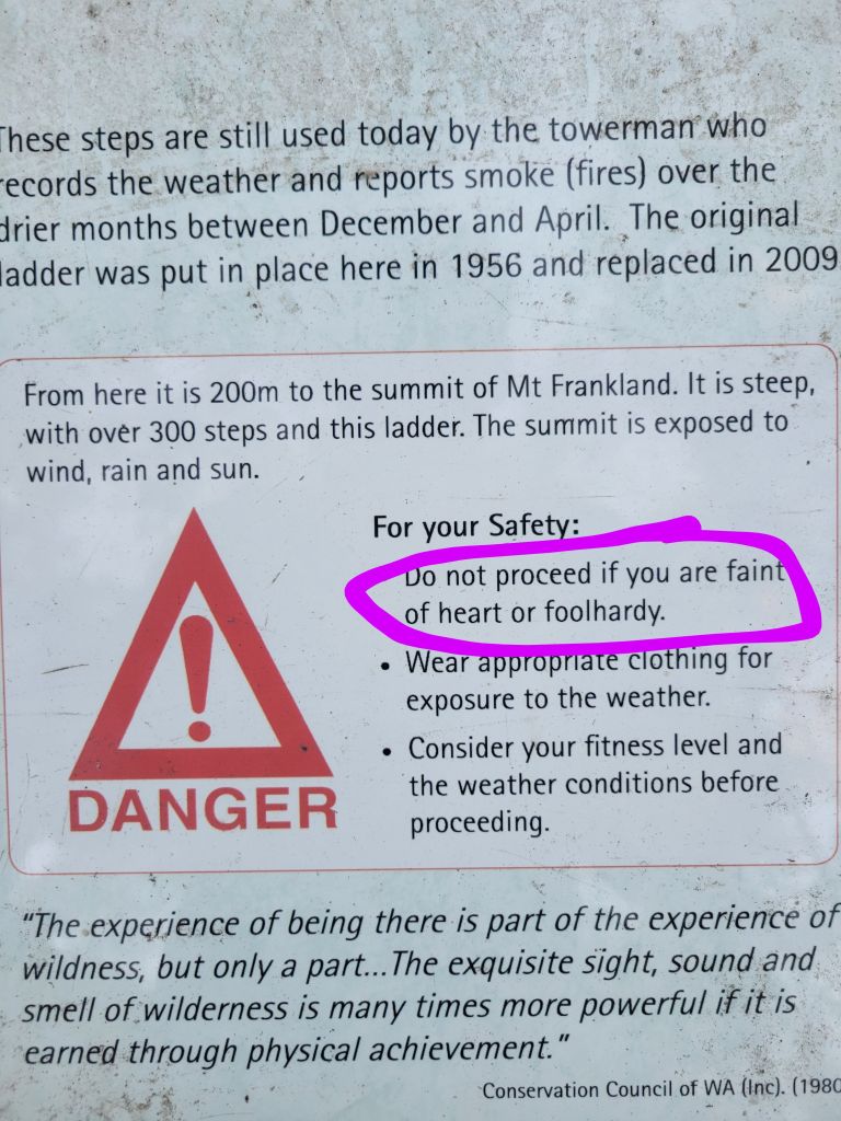 The next day I got up early and hiked the Nancy Peak circuit in Porongurup National Park. It was a really pleasant hike with a little bit of elevation (a true rarity in Australia) and some sweet views of the surrounding farmland with the Stirling range rising up out of it. There isn’t much hiking culture in Australia so I had the trail to myself and really enjoyed the solitude. After quickly snarfing a PB&J I headed over to another part of Porongurup to check out the granite skywalk. This is a shorter, easier trail to a boulder pile where the parks department has built a ladder up to an observation platform. It was, accordingly, way busier, so I was dodging families the whole time and had to wait a solid while at the end for people ahead of me to make their excruciatingly slow way up or down the ladder. It was still a nice walk and a nice view, but I have to say I prefer my hiking trails a lot less busy and manicured.