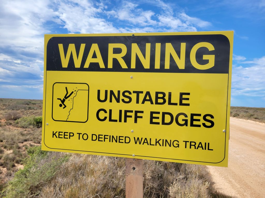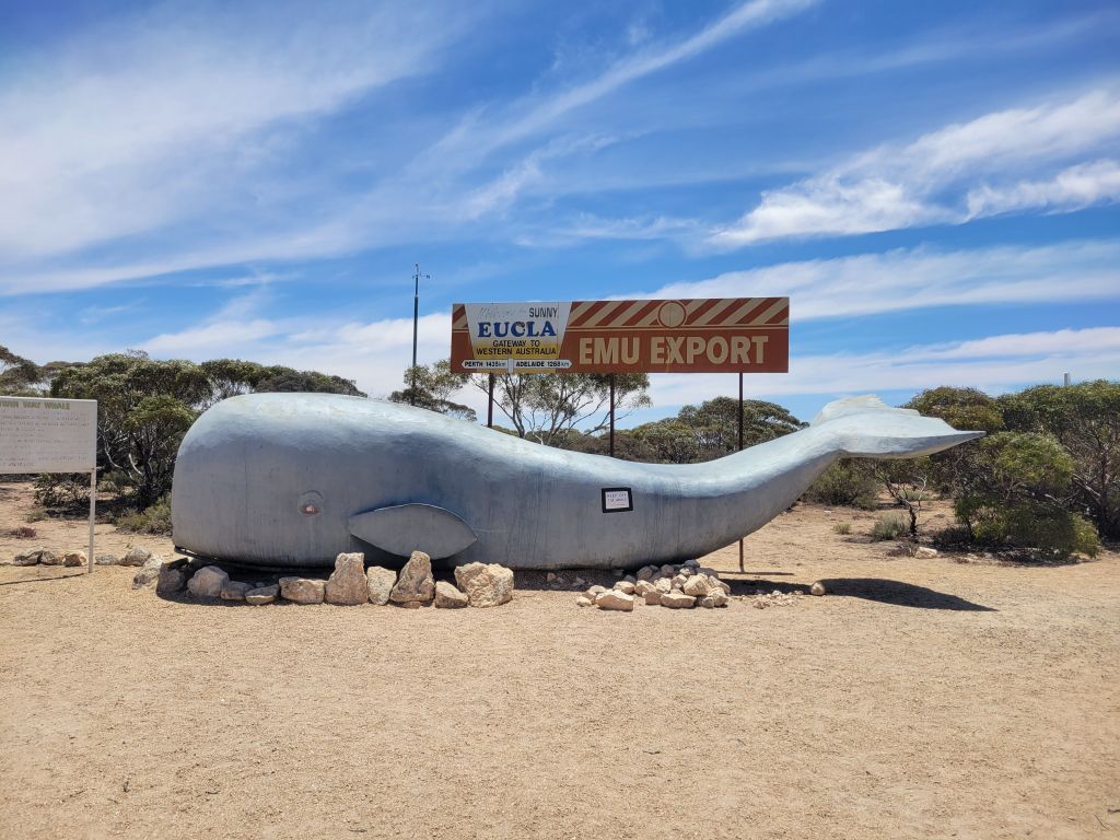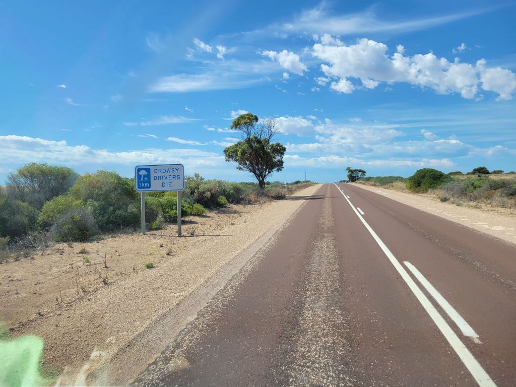 I am the whale.When you cross into South Australia the rest stop signs go from gentle admonishment to outright threat.They love health and safety warnings in Australia, and the more dramatic the graphics the better.Rain showers and blue sky.