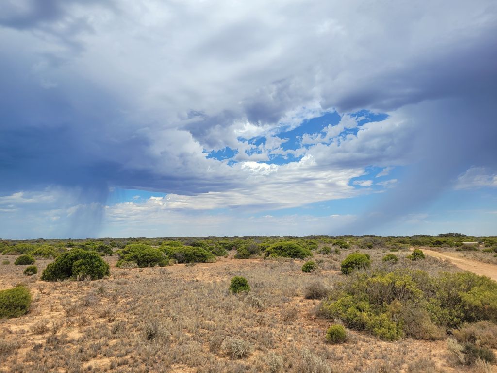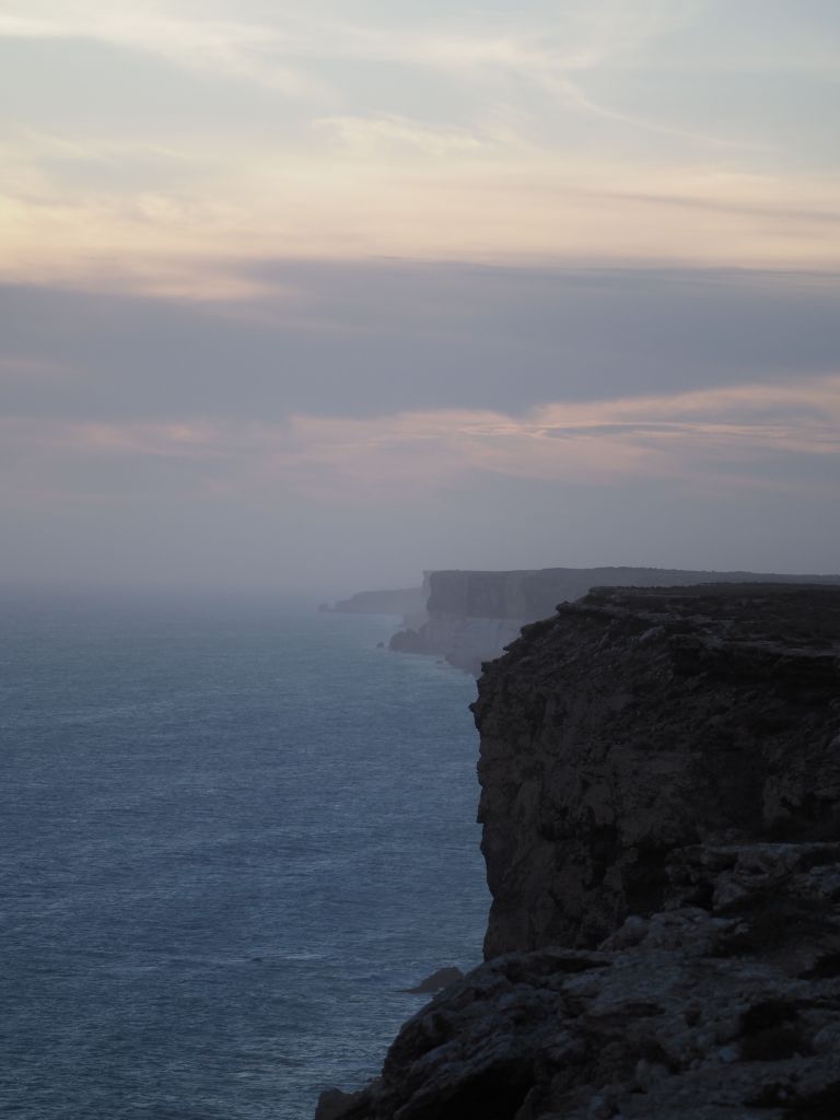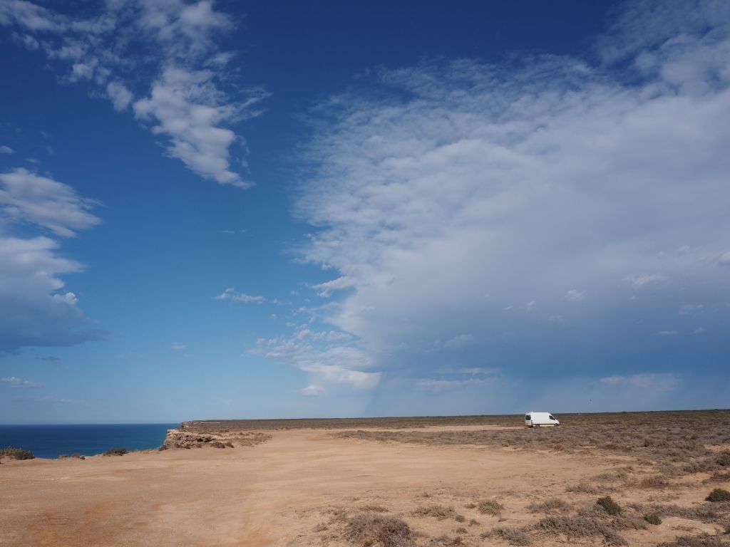 After crossing over from WA I spent the night just on the other side of the border in SA, out by the cliffs. I bundled up against the (welcome, after so much roasting in WA) chill and drank tea out by the edge of the cliffs, soaking it all in. The next day I woke up to just the perfect weather for the area—partly cloudy, patches of blue sky here and there, and a couple of narrow columns of rain with the occasional lightning bolt cascading down dotted throughout the massive landscape. I made slow progress east, pulling in to every clifftop viewpoint I could find, appreciating the rumble of the thunder, and generally just having a great day.