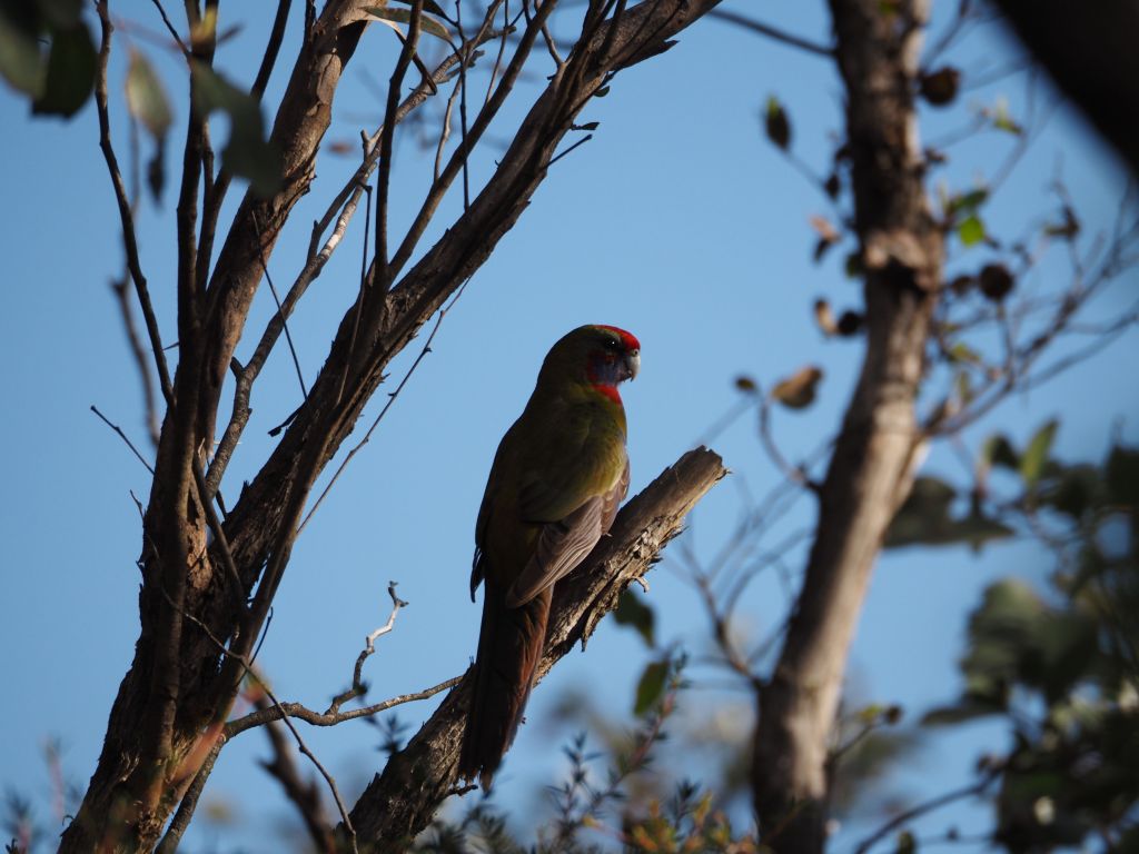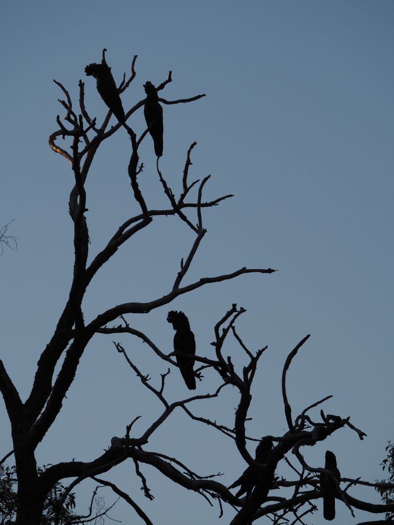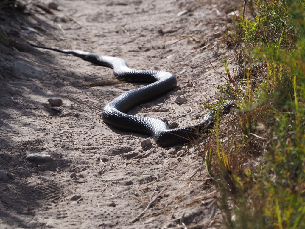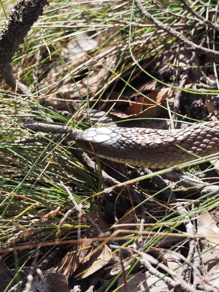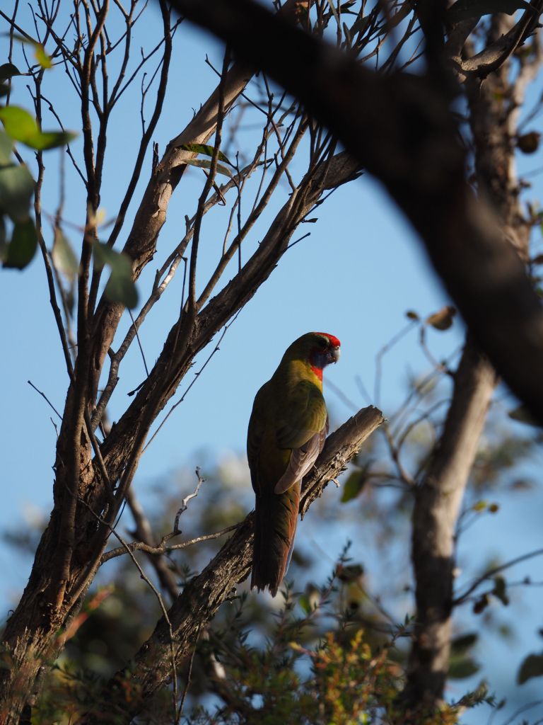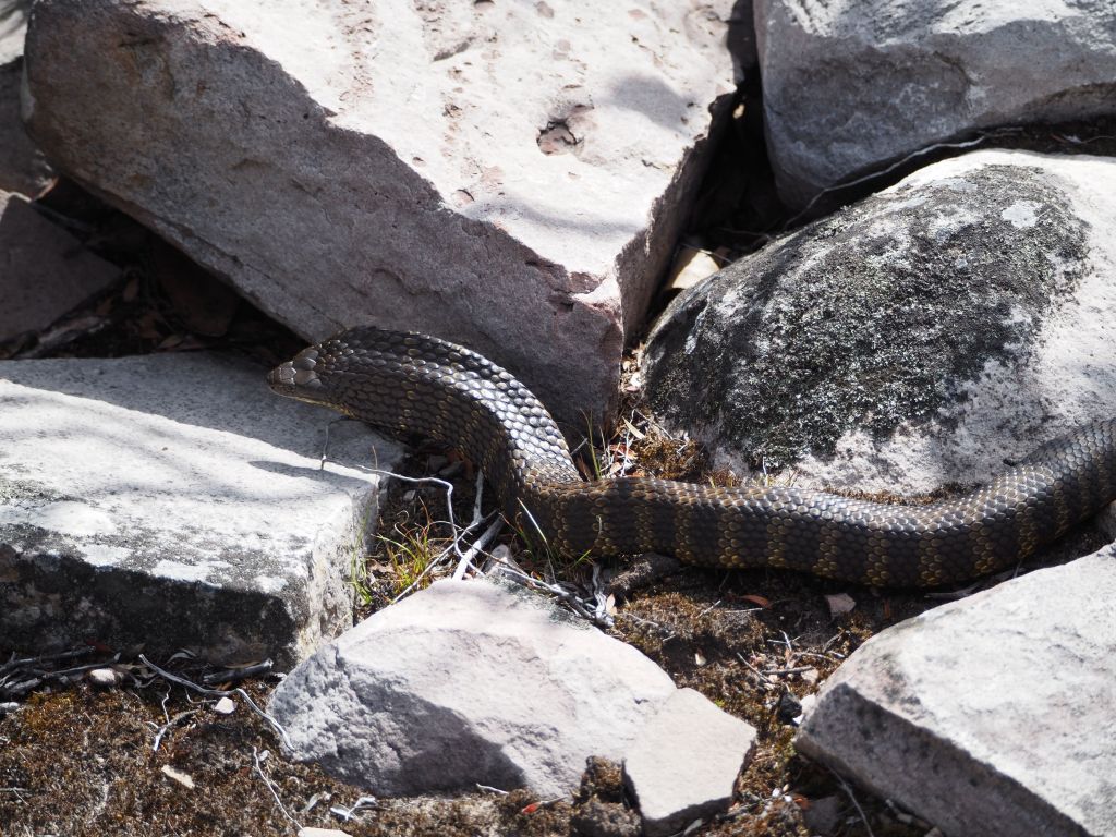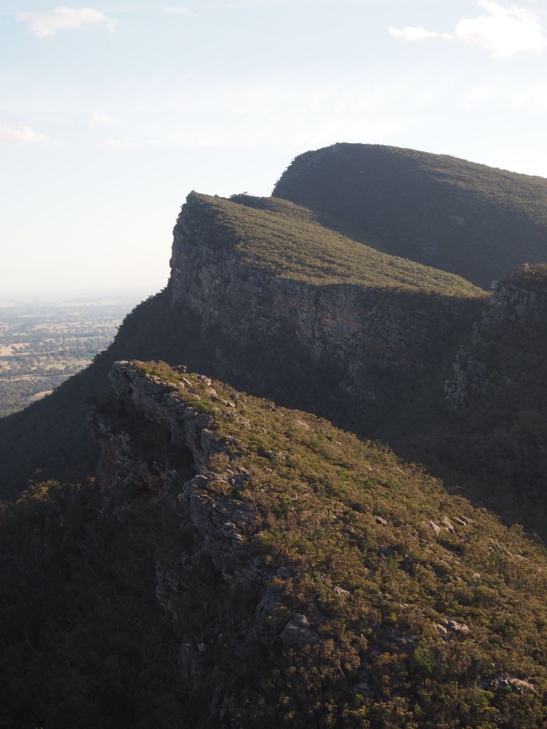 The next hike was Mt Abrupt and Signal Peak, and it was great. They’re neighboring peaks at the very southern end of the Grampians, so in one direction the view is mostly farmland, but looking the other way shows the whole sweep of the Grampians rising away to the north. I started up Mt Abrupt, following stone steps up the ridge right to the top. I was a bit tired and daydreamy but a brown snake suddenly slithering away between the rocks right next to me snapped me to attention and got me staring at my feet the whole rest of the way up. After a quick snack at the summit and with afternoon slowly turning into evening I started to head down, excited to check out Signal Peak and then get to a campsite at a reasonable time. Some combination of fatigue and this wanting to make sure I made the right move made me perfectly susceptible to the absolute worst trail sign I’ve ever seen, which guided you through a fork in the road not by signaling to either take the right or left trail, but rather by seemingly indicating the actual angle of each trail, which functionally made it look like three arrows pointing in the exact same direction. I looked hard at it and even thought “that’s weird, those three trails shouldn’t be in the same direction”, but who was I to question the sign? This wrong turn ended up having pros and cons—it added a bit of time to my hike, but going down the much less traveled back side of the mountain let me cross paths with several more cool snakes, which I managed to snap a couple photos of. The forest back there was also just tremendously beautiful with the late afternoon light filtering through. I laughed at myself for taking the most obvious wrong turn in history, laughed at the sign for how unbelievably ill-conceived it was, and double timed it towards Signal Peak. That section of the hike was also beautiful, and I got treated to a couple of sightings of some beautiful parrots (or rosellas, I’m not quite sure), but at that point I was pretty tired and it was pretty late so after a quick look around the summit I scampered on down to the van. The short drive to the campsite saw me nervously pass about a dozen kangaroos or wallabies staring at me from the side of the road, never letting on whether they were going to suddenly bounce out right in front of the van. Luckily I made it without incident and the campsite was beautiful.