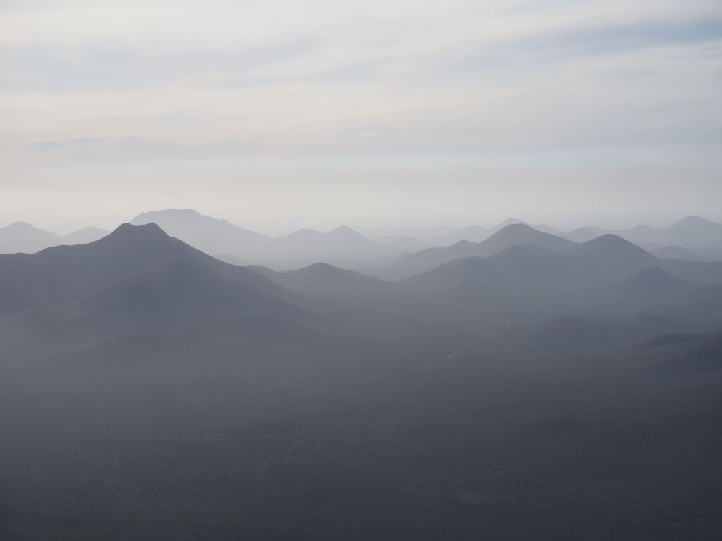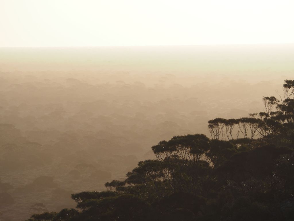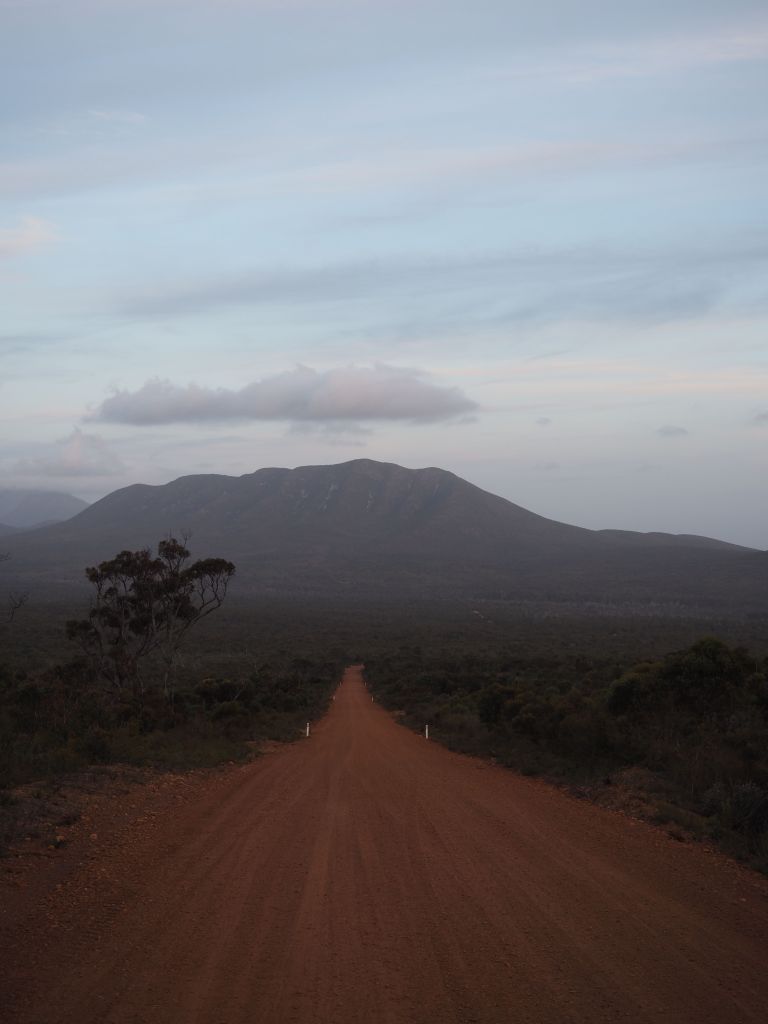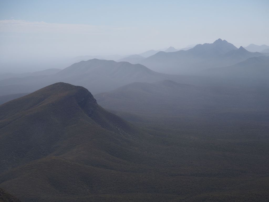 Next I continued down to Stirling Range National Park. This park is a weird rectangle of “mountains” (they’re hills, really) that rises up out of what is completely flat farmland as far as the eye can see all around. It’s beautiful though, all untouched desert scrub forest stuff, and there are really a pretty large number of different peaks. The first day I hiked a couple of the less frequented ones in the western side of the park—Mounts Maggog and Toolbrunup. It was a great chance to destroy my out-of-shape quads, get some solid views, and enjoy the scenic drive through the park. I don’t know what it is about this area but every day as the sun gets low the whole Stirling range seems to get shrouded in mist/fog/dust, and I couldn’t get enough of the jumble of misty peaks fading into the distance.