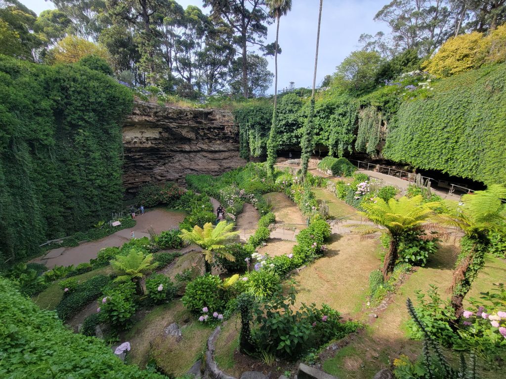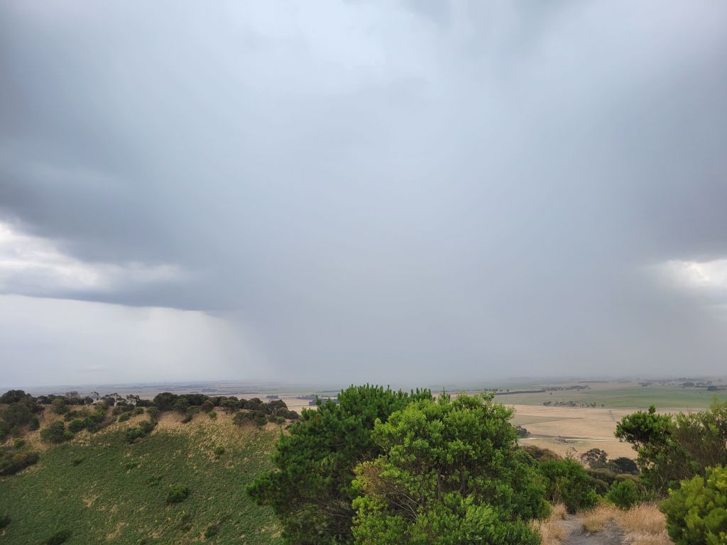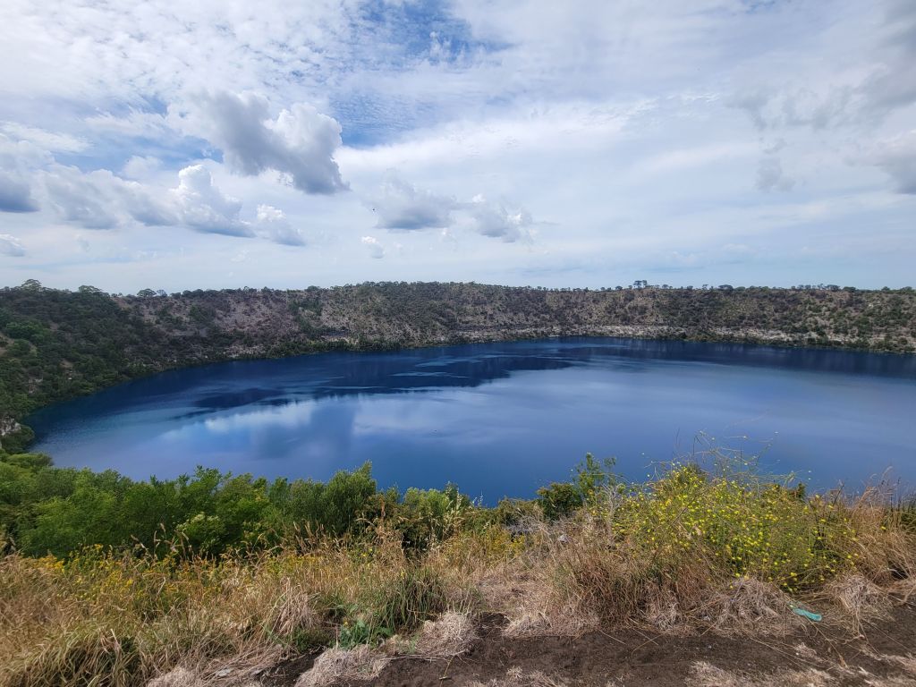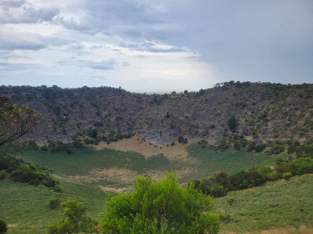 The next day I took the van in and hung around a couple of cafes. They were quick with the service so I said my goodbyes to Adelaide and headed out of town towards Mt Gambier, in the very southeast corner of South Australia. This area is perhaps unimaginatively known as the Limestone Coast and is known for a string of sinkholes, including some filled with crystal clear water. The first one I visited was Umpherston Sinkhole. This one is right in town, and it’s famous because some crazy rich guy back in the day wanted to turn it into an attraction, covering the walls in huge mats of ivy and planting tiered gardens in the bottom. He did a great job! It’s beautiful! I especially enjoyed it because I hadn’t looked it up beforehand and only stumbled onto it while looking for a bathroom, so it was a delightful surprise. After that I went to walk around Blue Lake, which is exactly what it sounds like. The color really is a tremendously deep blue and very beautiful. Lastly I went a little ways out of town to check out one of the dormant volcanoes in the area, Mt Schank. It’s pretty neat because it is really clearly a volcanic crater. A short hike up gets you to the rim, which you can walk around. When I got there I could see dark clouds and rain on the horizon and coming fast, so I packed my dry bag and decided to hustle. Sure enough the storm moved faster than it seemed like and I ran the last third of the crater, getting caught in the deluge for the last bit of the descent. It was really nice.