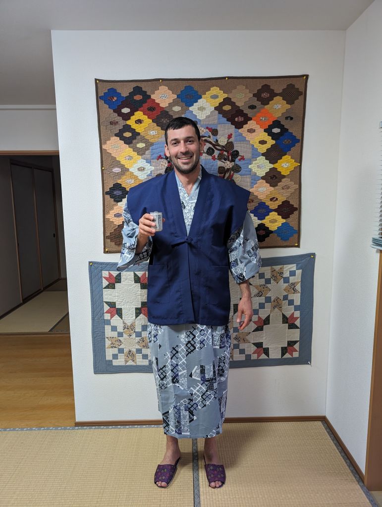 From Osaka we took the train a couple of hours south to Tanabe, where we spent the night in a more western-style hotel. Many hotels and guesthouses here provide yukatas, a type of light kimono often worn indoors and/or as a bathrobe. Normal ones are probably what you’d imagine—nice patterns, you wrap them around yourself and hold them closed with a sash. The one in Tanabe seemed to be some kind of cultural fusion situation, as it was all white and buttoned all the way down the front. This was… a shockingly bad choice. In combination with the unusual black leather slippers (slippers are also typically provided since you take your shoes off pretty much everywhere indoors, but they’re typically patterned, again as you’d expect) that looked like ladies’ pumps it made for quite an exceptional look.