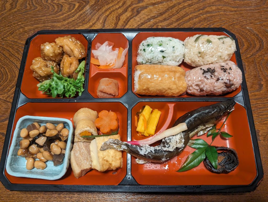 We originally thought this was some kind of plastic but it’s actually this crazy ribbon ice.That’s a big gate!I was.Humans for scale.A fancier three-legged crow.Bento dinner from our guesthouse. So, so delicious.Another great outfit, but no slippers 😦