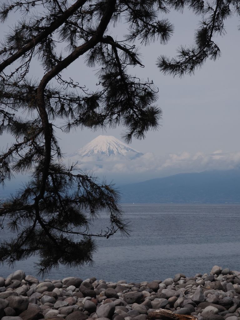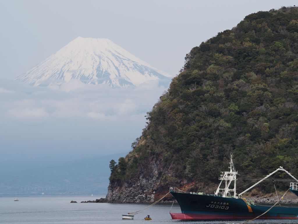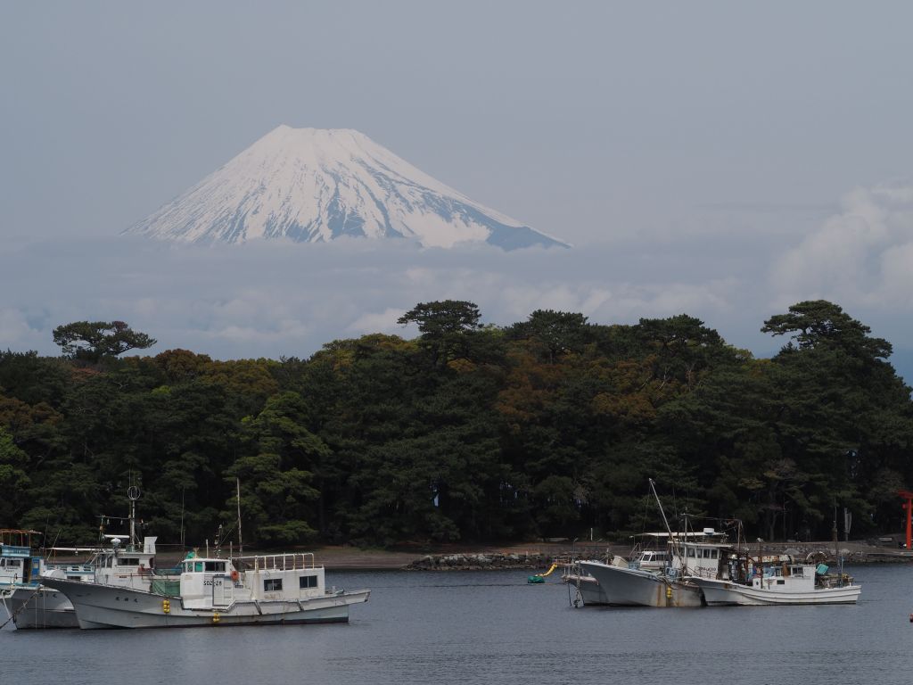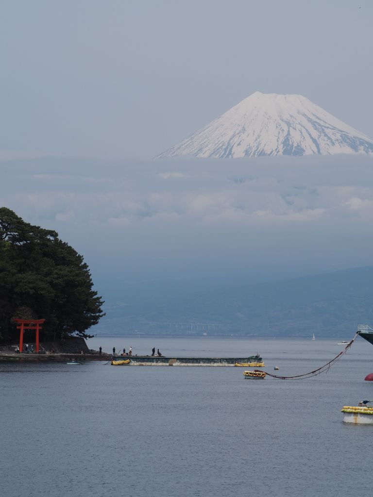 Heda turned out to be an adorable little town with incredibly fresh seafood, rows of beautiful cherry trees by the river without massive crowds, and tasty coffee at my comfortable hostel. The only question was whether I’d get a glimpse of Mt Fuji. My hostel sat right on the waterfront of a bay with a narrow opening to the northwest, so the view of Fuji required walking a ways around the bay to get to its southern and then eastern sides, peeking between each gap in the buildings to see if I could catch a glimpse. It was a somewhat cloudy day and I figured it was a lost cause, but the walk would be nice anyway. After a particularly long stretch of buildings blocking the view, I came out into a parking lot expecting more blank cloudy vistas, and BAM! There it was. The surprise added to the experience, but either way I can’t really describe what it’s like to look at Mt Fuji. It’s just mesmerizing. During my stay the bottom of the mountain was blocked by clouds, so the perfectly conical, snow covered top just floated out above the city beneath it. It dominates the vista, looming over whatever happens to be in the foreground—fishing boats, torii gates, or just an expanse of water. I spent at least an hour just admiring it from all different vantage points, and I honestly had trouble tearing myself away. This was an experience that absolutely lived up to expectations.