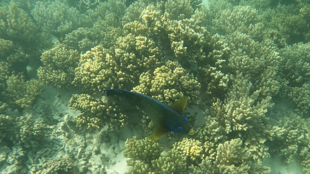 Exmouth town sits on the east side of the peninsula, and is really just a place to get supplies and go on tours. The reef, which is the main attraction here besides whale sharks, runs along the western side of the peninsula, which is all a national park. Some fun facts—it’s the biggest fringing reef in Australia, at 260 kilometers (160 miles) long, and at certain points it’s less than 500 meters (about a third of a mile) from shore. I guess the proximity to shore is what makes it a fringing reef rather than a barrier reef like the, um, Great Barrier Reef, which is way way way bigger but also much farther from the shore. What all this means is that you have your pick of absolutely incredible snorkeling just swimming out from the shore.