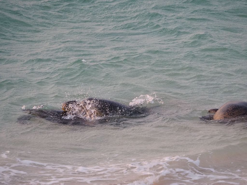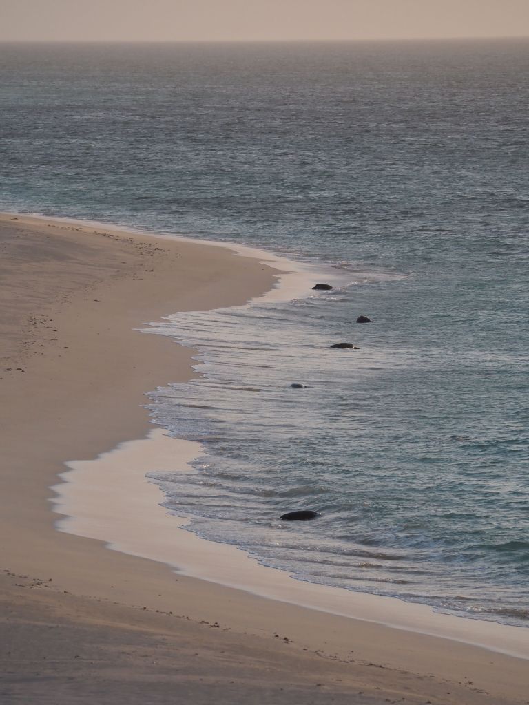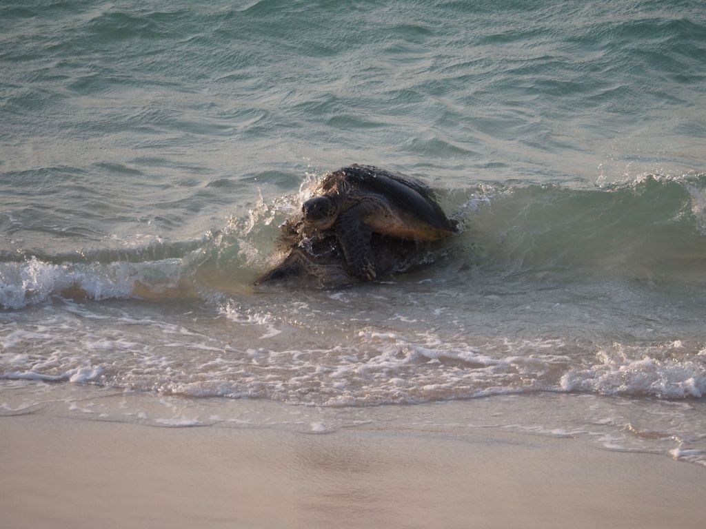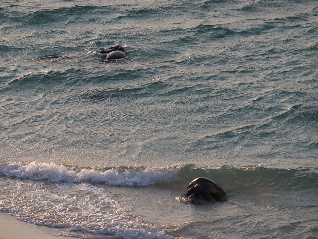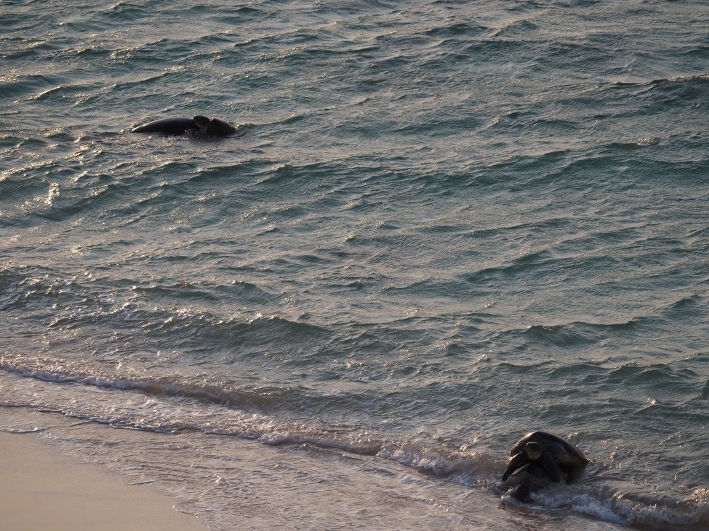 Lastly, Ningaloo is an important breeding ground for green, hawksbill, and loggerhead turtles. There’s a beach in particular where you can see huge numbers of massive loggerhead turtles, either doing the deed (frankly a pretty brutal sight, the males are relentless) or resting on the beach. The giant sand dune right there gives a great view down onto the water, where there are dozens of huge splotches showing turtles hanging out in the bay. In a little while the females will be nesting, and in another month or three the hatchlings make the dash for the ocean, but right now mating is the show.